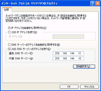 18.「インターネットプロトコル(TCP/IP)」の画面が表示されますので以下のように設定し、「OK」をクリックしてください。